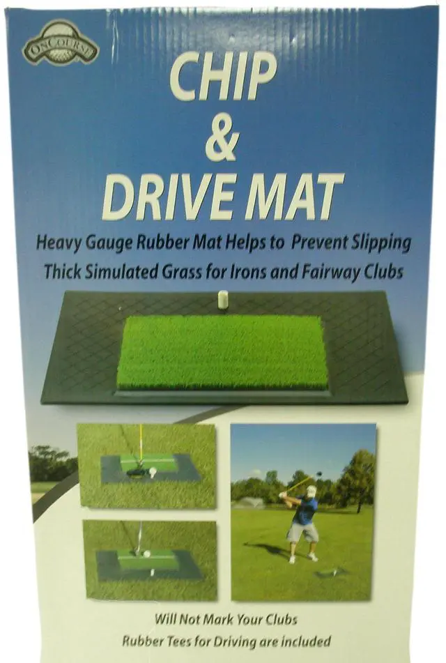 MODEL SPECIFICS: 24"x14" heavy guage rubber mat helps prevent slipping. Rubber tees included. 14"x8" thick simulated grass for irons and fairway clubs.
