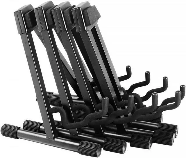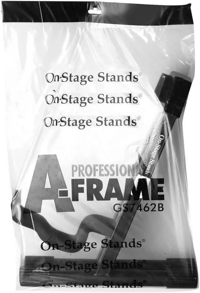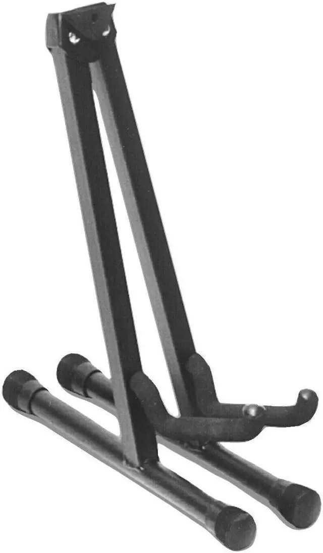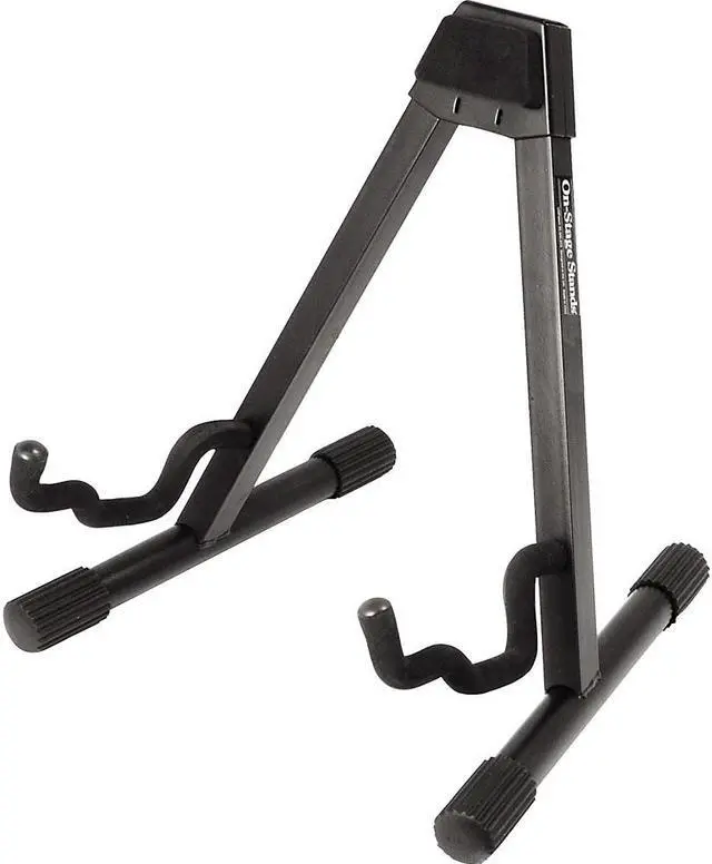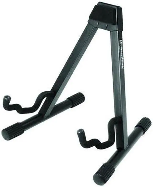 The On-Stage GS7462B Professional Single A-Frame Guitar Stand features heavy-duty 1" square tubing, velveteen rubber and a "uni-construction" design, meaning that there are no parts to lose. It holds acoustic and electric guitars as well as desktop mixers and combo amps. No more need to own multiple stands when this patented stepped yoke design can hold it all. The unique shape also allows this stand to nest together with others when not in use.