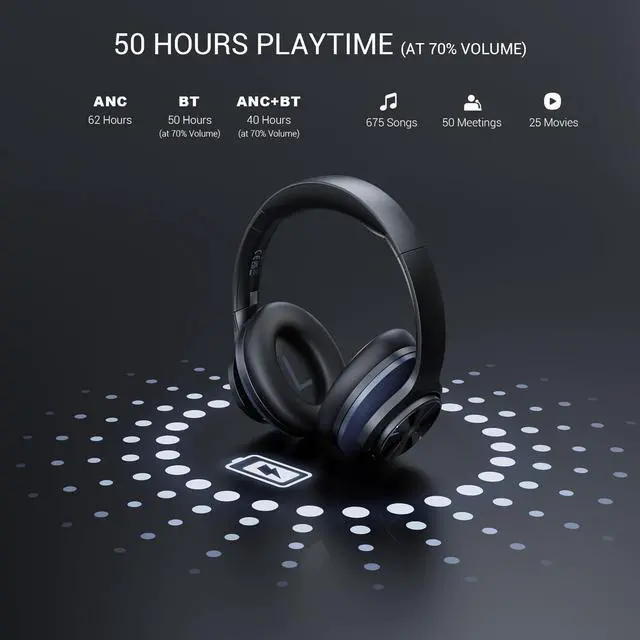 62 Hrs Long Battery to Keep You Active: The premium Li-ion battery provides 50 hours of earphone music, movie watching, or talk time in Bluetooth mode (at 80% volume), 62 hours in active noise cancellation mode. A 5-minute fast charge provides 2 hours of listening time. Ideal for travel and everyday use, indoors and outdoors.