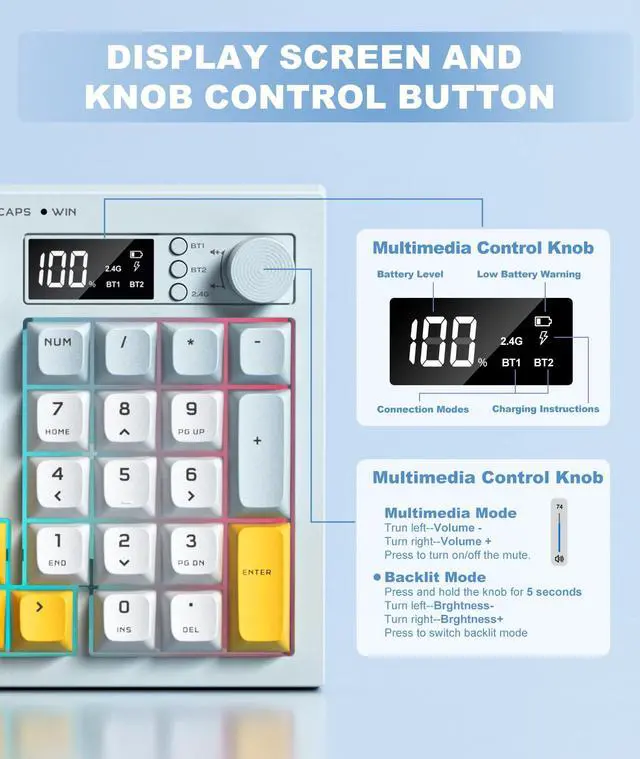 | LCD Screen&Multifunction Knob | Mute Button | Noise Cancellation | Noise Cancelling Mic | 2.4G + Bluetooth 5.3 | 20ms Ultra-Low Latency |