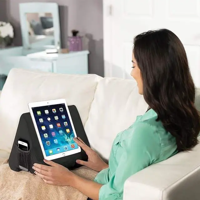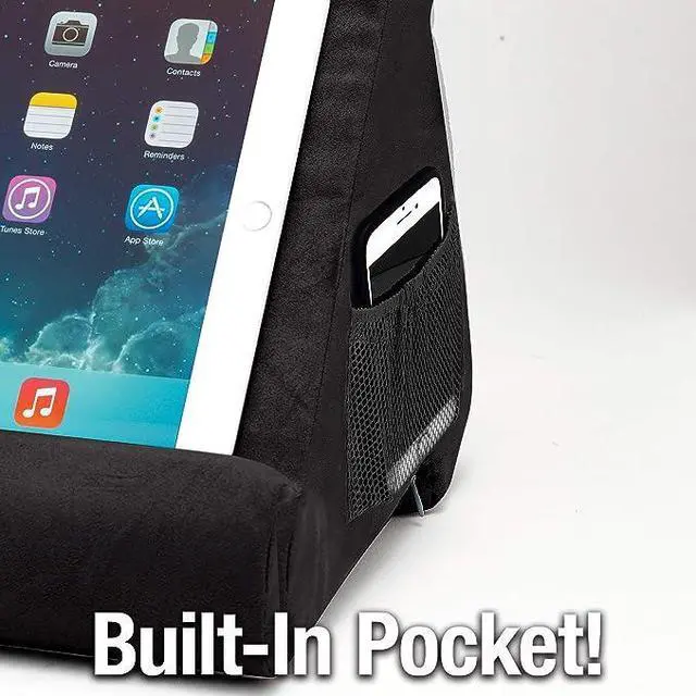 Pillow Pad Ultra's New Extra Large Pocket Allows you to fit your table for extra safety. Pillow PadUltra's built in ledge securely props up your device or book. Use Pillow Padfor reading, watching movies or TV shows, browsing the web, playing games, doing homework and more! Pillow PadUltra helps to relieve uncomfortable neck and hand strain. Pillow PadUltra is made of ultra-durable, light weight foam providing stability and comfort. The ultra-suede cover is removable and machine washable. Best of all, there is a built-in side pocket to hold your phone, glasses, charger, earphones and more.