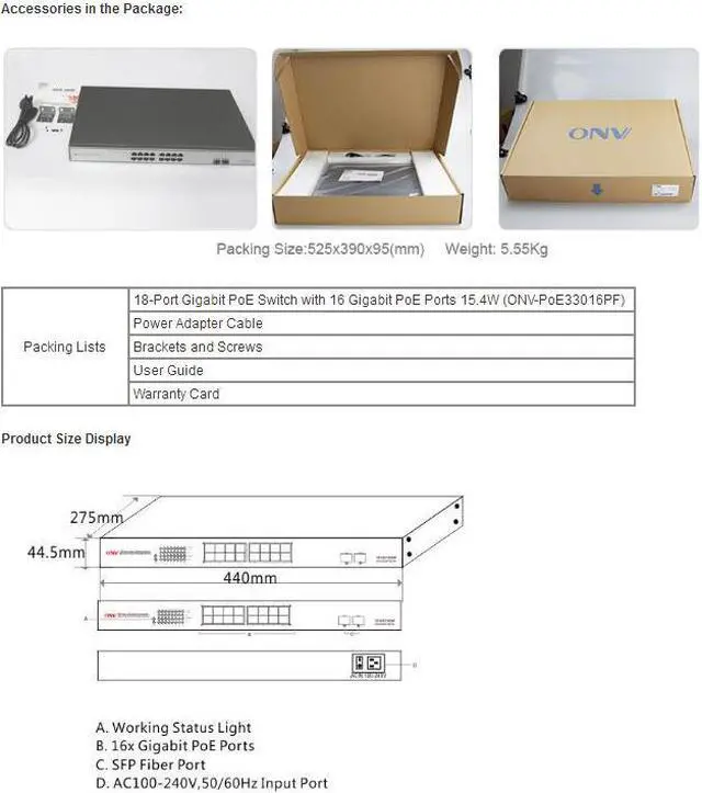 Features:? Supply power to 5 classes Ethernet wireless access point (AP) and network surveillance cameras (PoE)? Port1 to Port16 compatible with IEEE 802.3 af standard? Maximum power of each port is 15.4W, 250W for total? 16x 10/100 /1000Mbps automatic adjustment RJ45 PoE ports, 2x 10/100 /1000Mbps SFP fiber uplink ports? Meets the standards of the IEEE 802.3 af/ IEEE 802.3 10i and IEEE 802.3 u standard? The packet forwarding speed of the wire-speed port is 1.488M bps? Network port has lighting-proof function (AC power port: differential mode +/-2kV, common mode +/-4kV)? All ports support wire-speed switching, frame size within the range of 64 to 1536 can achieve wire-speed? 1U Rack mounted design, easy to install and use? Automatic adjustment, plug and play, no need software and protocol conversion