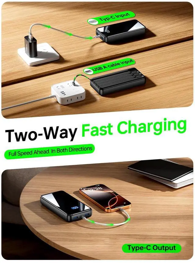 Portable Charger Built-in 4 Cables: Eliminate cable clutter forever! This portable charger power bank comes with 3 output cables (Type-C, iOS, Micro-USB) and 1 input USB-A cable to instantly connect to virtually any device. Plus, 3 additional ports (1 USB-C IN & OUT, 2 USB-A) offer ultimate charging flexibility for your whole squad