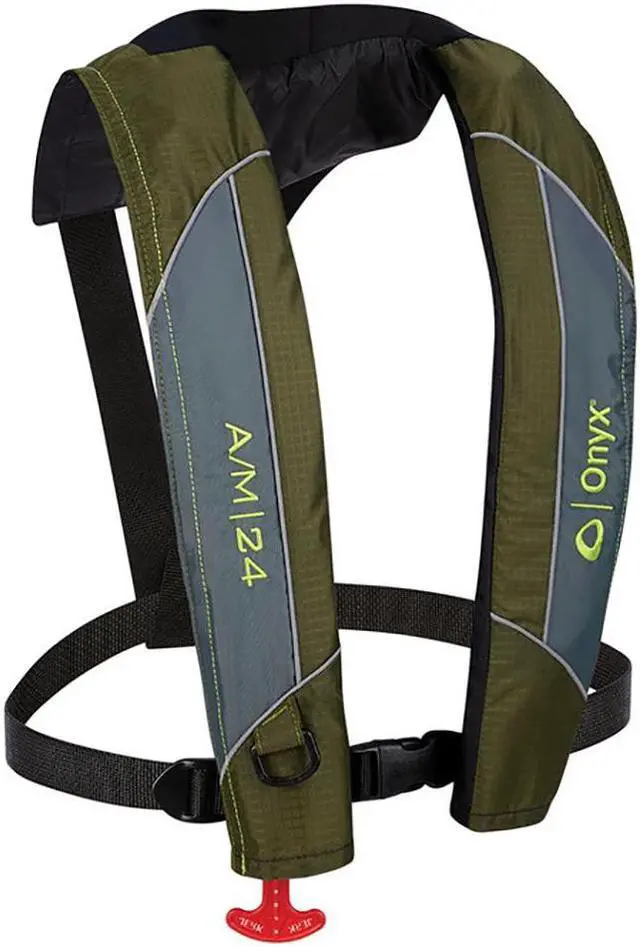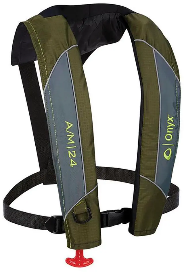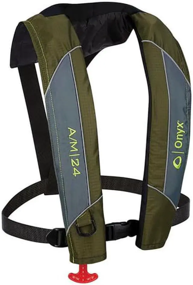 Auto - Manual Inflatable Life JacketStay safe on the water with the low profile Onyx A/M - 24 Inflatable Life Jacket The A/M 24 inflates only when needed, so you can enjoy unrestricted movement while boating, paddling or participating in other water activities. It inflates automatically when its immersed in water, or when the wearer pulls the inflation handle. Made of durable ripstop fabric, this PFD features a neoprene neckline to bring you all day comfort on the water. FeaturesInflates automatically when immersed in water or when the user pulls the inflation handleLow profile, lightweight design provides unrestricted movementNeoprene neckline is comfortable for all - day wearMade of durable, ripstop fabric that is tear - and puncture - resistantReflective piping is highly visibleV - back design provides a comfortable fitReliaPull Guide for predictable inflation and assistance with repackingReusable mesh carry bag includedUS Coast Guard approved Type V Life JacketUniversal sizing fits adults over 80 poundsNot approved for children under 16 yearsBrand: OnyxCountry of