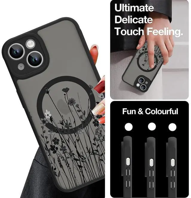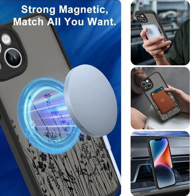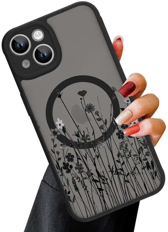 Magnetic for iPhone 14 Case Cute Floral Design for Women & Girls, [MagSafe Compatible] Slim Translucent Matte Black Cover, Camera Protection, Chic & Stylish (6.1")