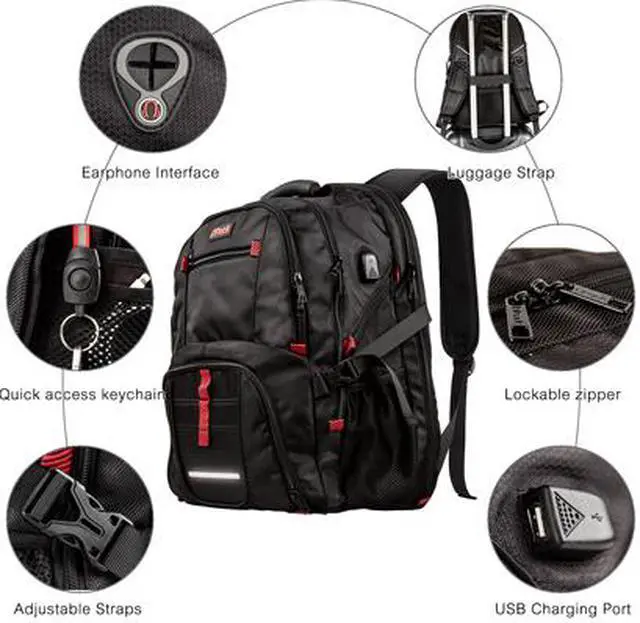 LOTS OF FUNCTIONAL POCKETS -Main large compartment: Under 17 inch Laptop/notebook, text books, books, magazines, cameras, clothes -Front compartment: Wallet, pens, keys, cell phone, earphone, wireless mouse, watch, etc. RFID anti-theft pocket: Bank cards, memory card LOTS OF FUNCTIONAL POCKETS Multi-panel airflow design provide relief when carrying heavy loads, less stress on your shoulders. -Foam padded top handle ensures you comfort in case you have to carry it for a long time -The padded bottom relaxes you when carrying the business laptop backpack Convenient USB Charging Port -The long lasting business laptop backpack offers you more convenience and freedom. -Please note that this backpack doesn't include a power bank, USB charging port only offers an easy access to charge. Water resistant -Computer laptop backpack is well made of premium quality Polyester Fabric -The traveling backpack is built for strong, sturdy and solid. It is water resistant and perfect for travel. RFID anti-theft pocket -The secure travel backpack adopts RFID anti-theft design technology. -RFID stands for Radio Frequency Identification, which could help avoid some thefts. -The slider of the Zipper of main pocket could hook up with the hidden hook in the side pocket. Avoid Theft -Side pocket: Water bottle, compact travel umbrella -laptops and functional pockets offer you security and keep all of your gear organized in its place