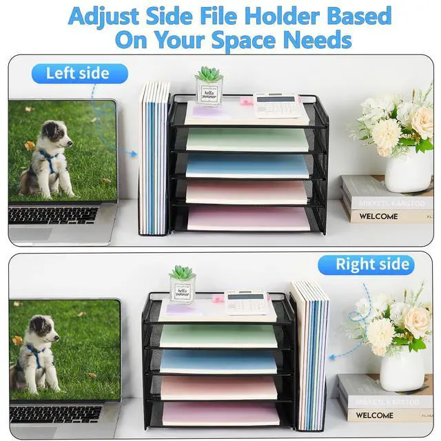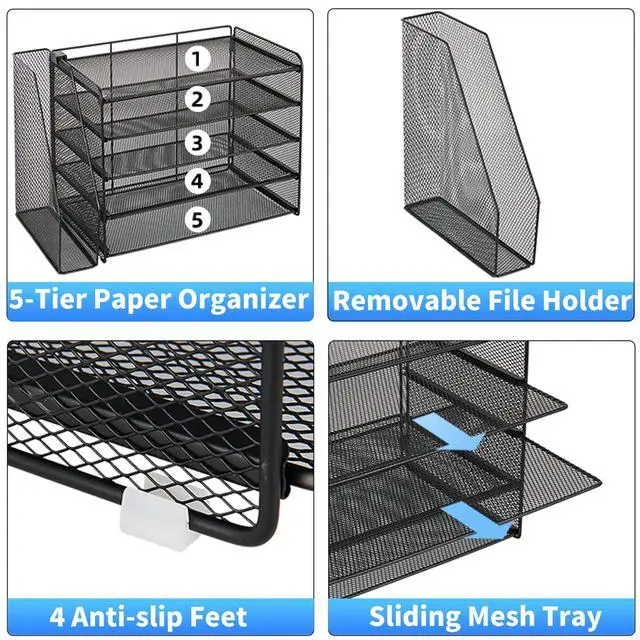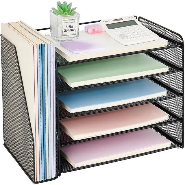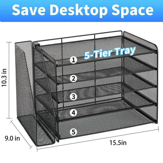 Large-Capacity Storage:Five vertical trays and a side file holder neatly organize papers, folders, magazines, and notebooks—keeping your workflow smooth and uninterrupted.