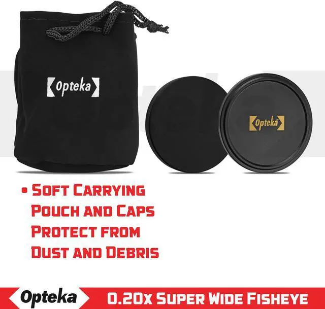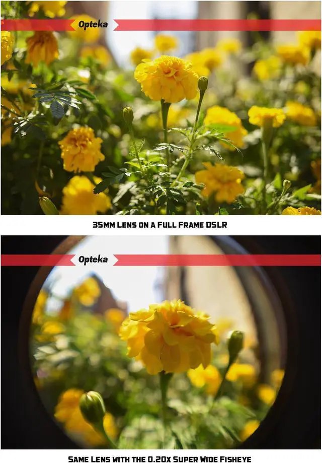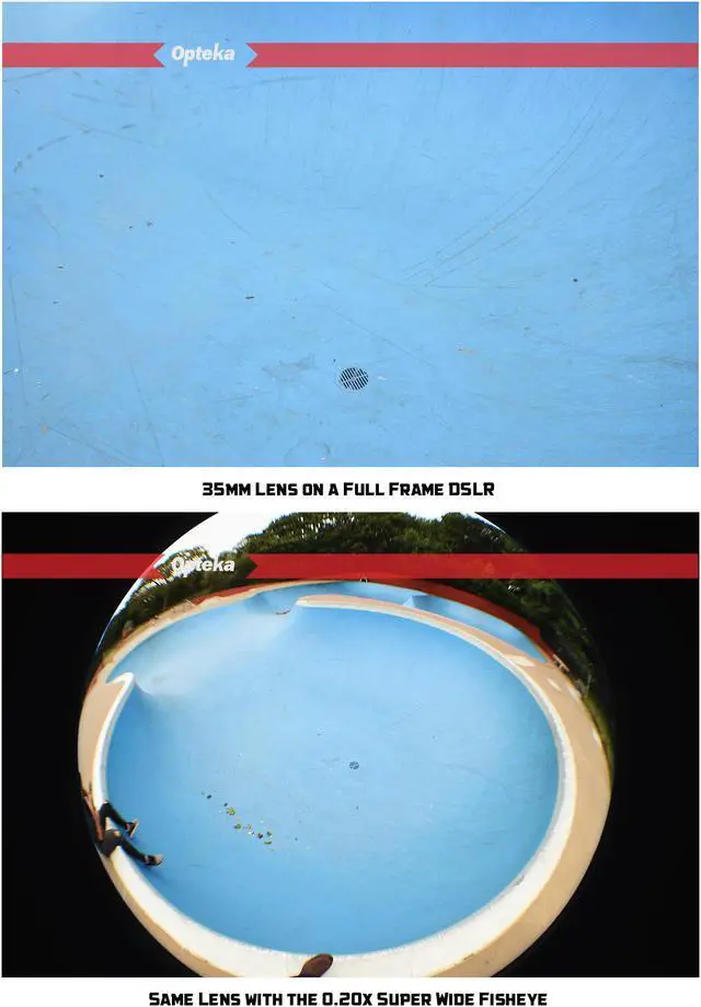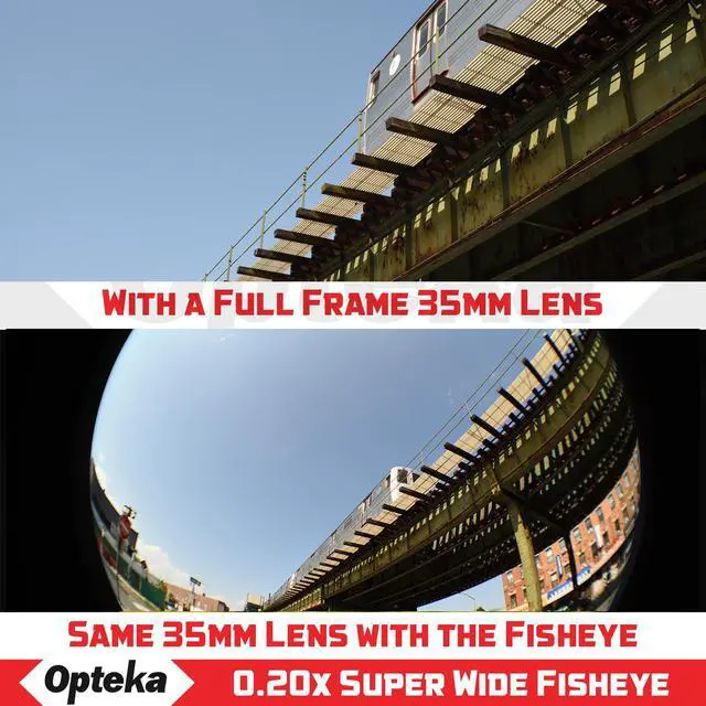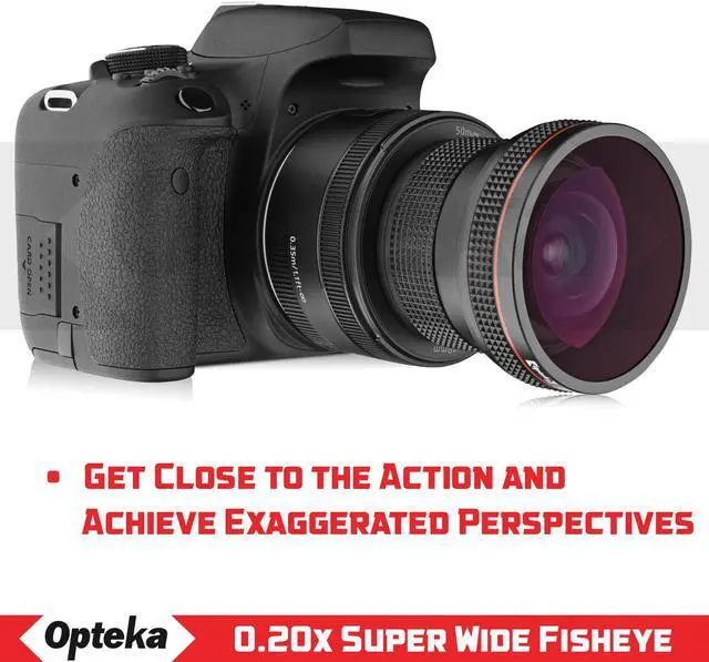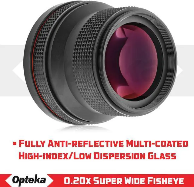 The Opteka .20x Ultra Wide Angle Fisheye Lens gives you a dramatic 180 degree view with a greatly exaggerated perspective when used with a digital SLR camera and its existing lens. For example, the Opteka .20x will convert a 18-55mm lens into a 3.6-11mm fisheye. A powerful circular image is produced, floating within the frame. One of the most unusual lenses a photographer can use as it produces a circular image within a black surrounding frame. It is ideal for extreme sports, landscapes and panoramic photography. This fisheye lens is designed so it allows the lens to work with the camera's autofocus, auto exposure, auto metering and auto white balance functions. Hybrid aspherical lenses and multi-layer coating help you to produce sharply defined images with a minimum of flare and ghosting. This lens will focus as close as 1' (0.3m) from the lens.