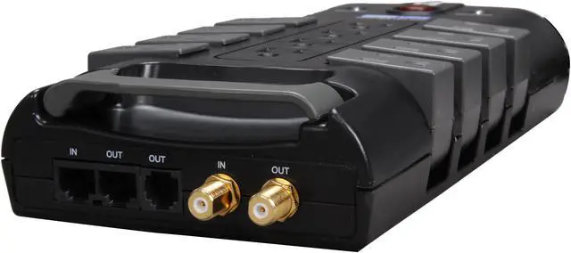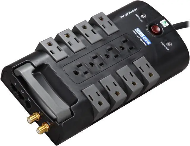| Features | Advanced X3 MOV Technology provides longer protection lifespan, better performance, and the ultimate SAFETY reliability. 12 Surge-Protected Outlets: 8 Rotating Outlets (90 degree) for extra spacing plus 4 Fixed Side Outlet for convenience 360° rotating AC plug designed to fit any difficult locations and to minimize waste of space EMI/RFI Noise Filtration up to 58 dB 4320 Joule energy rating provides optimal surge protection Max. Peak Spike Current rated at 252000 Amps and Max. Spike Voltage rated at 6000 Volts Phone / Fax / Modem Line Protection: RJ11 6P2C (1-out) and RS45 8P8C (1-in/1-out) combo Jack protection Network Line Protection DSS/COAX Cable Protection Cord management Design to avoid jumbled cable mess Protected Indicator to ensure surge protection is working properly Grounded Indicator to show that electrical wiring is properly grounded Surge Circuit Shut Down & Auto Power Shut Down in case of surge protected failure Power Push Button Integrates a 15 Amp Overload Resettable Circuit Breaker |