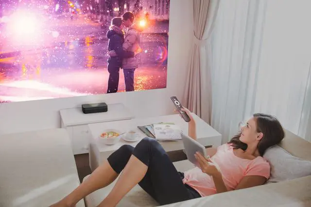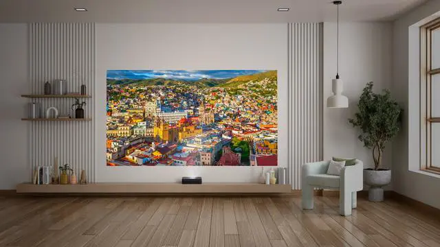 Set up anywhere with auto image alignment and auto focus —tabletop, wall, or floor! Create a massive 100" image from under 10 inches away, transforming any space into an immersive viewing experience.