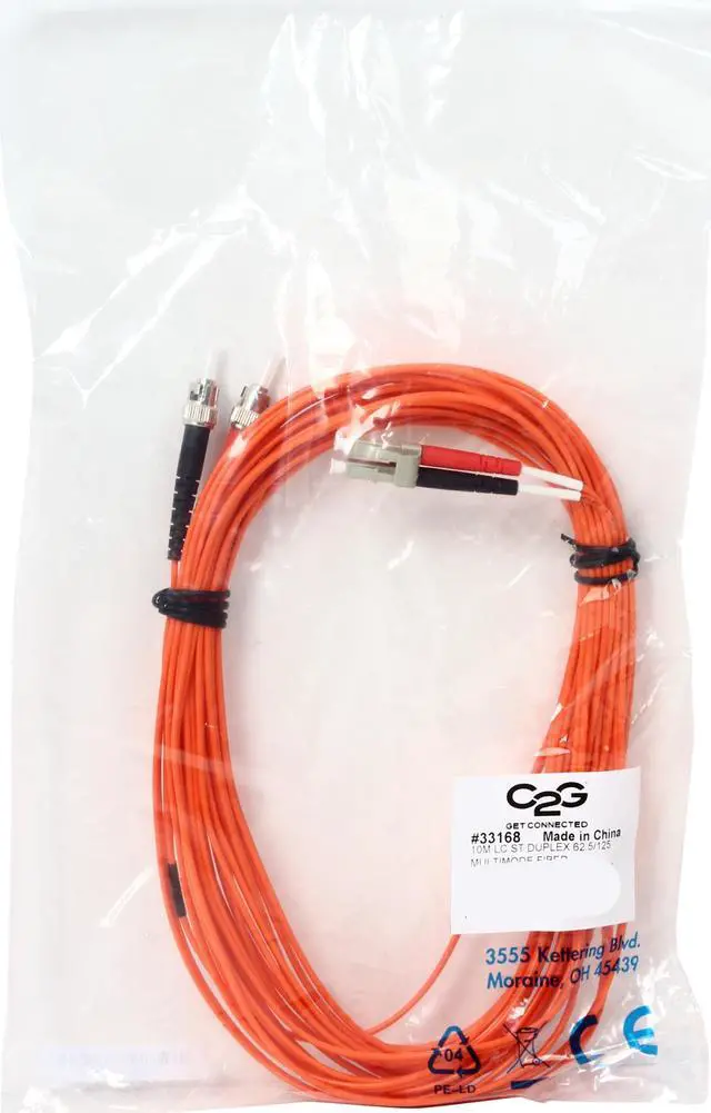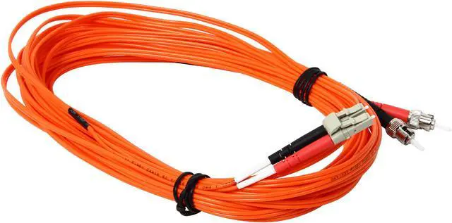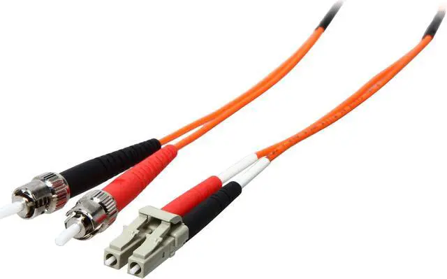 With LC to ST termination, this high-quality fiber optic patch cable is specifically designed for fast ethernet, ATM and gigabit ethernet applications. The small LC connectors satisfy the need for higher port density both in the telecom room and the work area, and offer twice the port density of traditional SC and ST fiber connectors. The LC connector with its RJ-style latch clip design is easy to engage and disengage, and gives each connection greater durability in resisting pulls, strains, snags, and impacts during cabling installs and maintenance. The ST connector features a bayonet locking system. The patented injection molding process provides each connection greater durability in resisting pulls, strains and impacts from cabling installs. Each cable is 100% optically inspected and tested for insertion loss before you receive it. A pull-proof jacket design surrounds the popular 62.5/125 multimode fiber, immune to electrical interference.