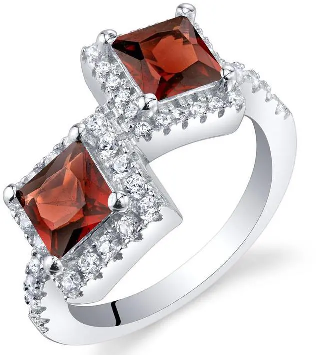 Its hip to be square. This ring offers twice the glam with its two genuine Garnet gemstones offsetting each other for an edgy visual effect. Both bold red stones are faceted for unparalleled light performance, and twinkling Cubic Zirconia accents adorn each square halo and cascade down the shingle shanks. Conflict-free, ethically sourced genuine gemstones only. Attractively boxed for easy gift giving.