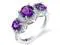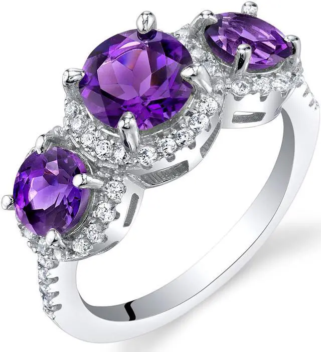 What a great way to honor your love! This ring features three vibrant purple stones perhaps representing today, tomorrow and forever. Each genuine Amethyst gemstone is wrapped in a halo of icy white Cubic Zirconia Cubic Zirconia accents that extend down the single shanks. Gorgeous hand cut facets add lots of texture and character. Conflict-free, ethically sourced genuine gemstones only. Attractively boxed for easy gift giving.