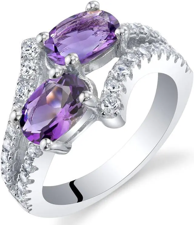 This stunning ring definitely works all the right angles. A pair of vibrant purple ovals are set horizontally and framed by Sterling Silver embellished with Cubic Zirconia. The genuine Amethyst gemstones radiate from hand cut facets as twinkling accents flow downward through the split shanks. Topping it off are prong settings that let light enter from all sides. Only ethically sourced, conflict-free genuine gemstones are used. Includes a box for easy gift giving.