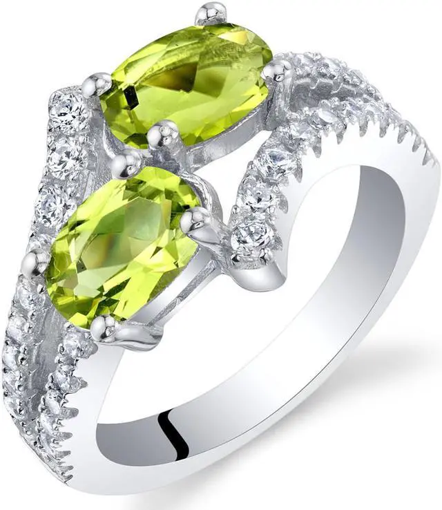 This stunning ring definitely works all the right angles. A pair of cool olive green ovals are set horizontally and framed by Sterling Silver embellished with Cubic Zirconia. The genuine Peridot gemstones radiate from hand cut facets as twinkling accents flow downward through the split shanks. Topping it off are prong settings that let light enter from all sides. Only ethically sourced, conflict-free genuine gemstones are used. Includes a box for easy gift giving.