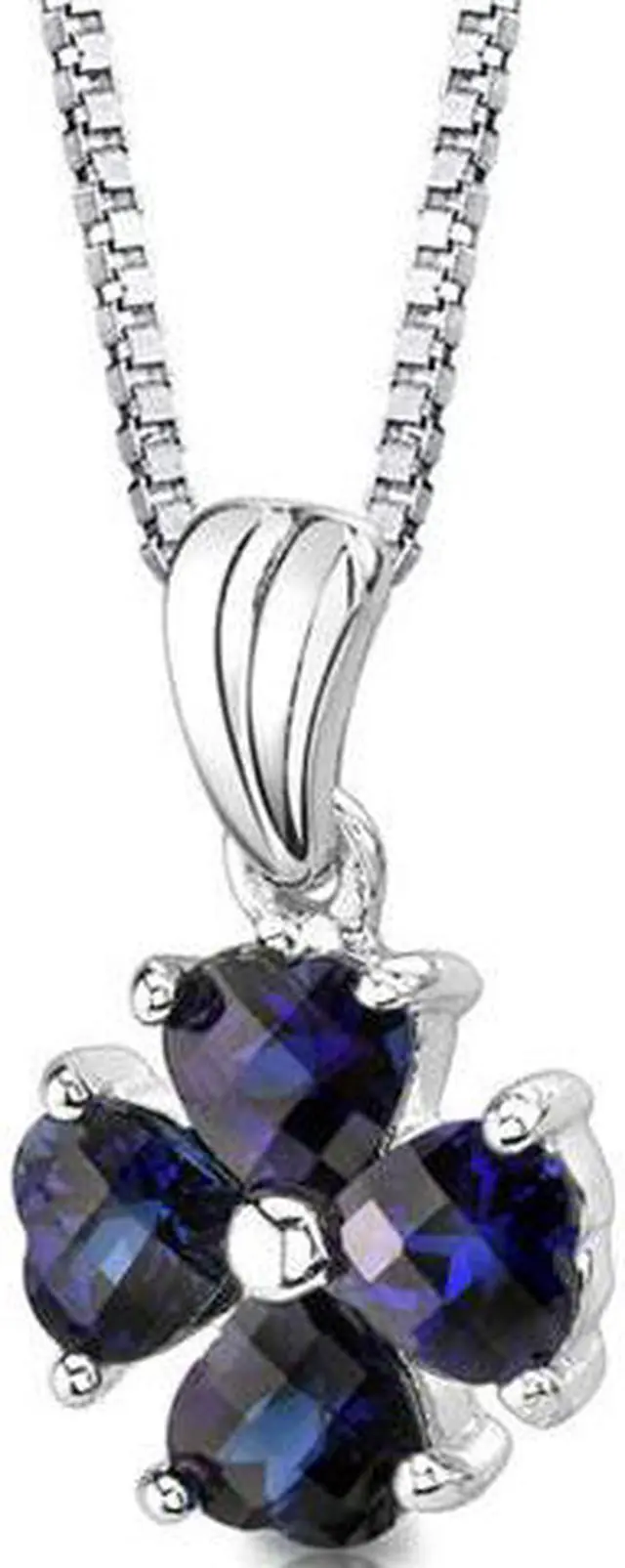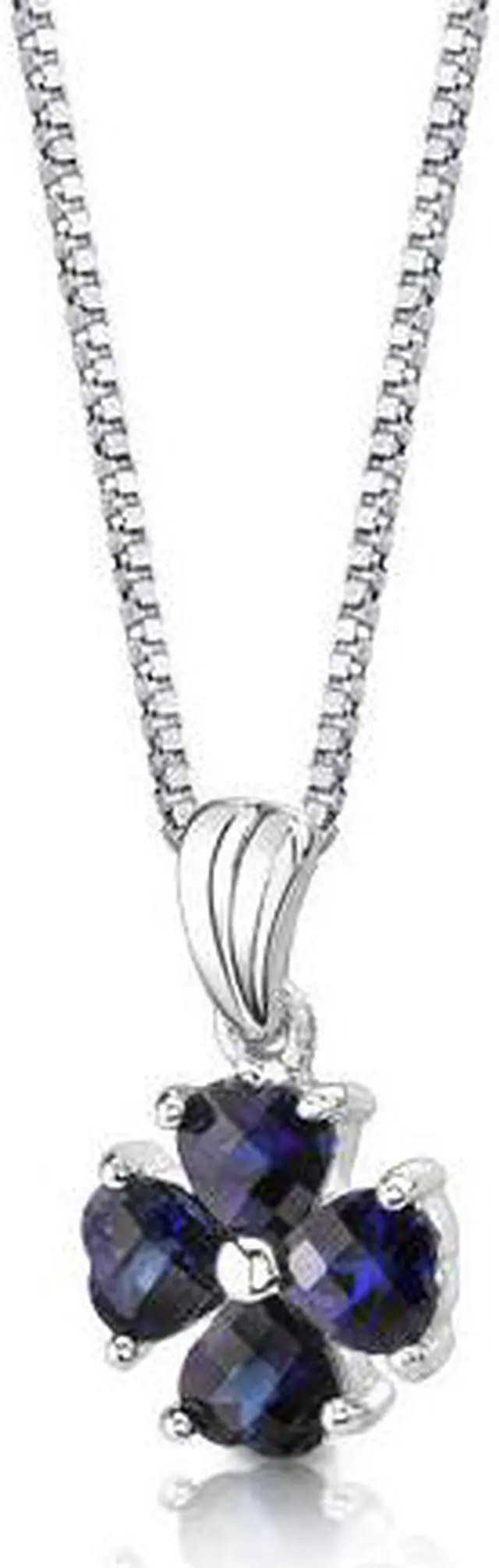 Gemstones: Lab Created Blue Sapphire, 4 pieces, Heart Shape, Checkerboard Cut, 5.00 mm. Gemstones have a vibrant rich color and eye clean clarity. Pendant is in Sterling Silver with. 925 stamp and measures 3/4 x 1/2 inches and weighs 1.70 grams. Pendant features top quality workmanship and a beautiful finish. Includes Free 18 inch Sterling Silver Box Style Chain, Free Ribbon Gift Box and.