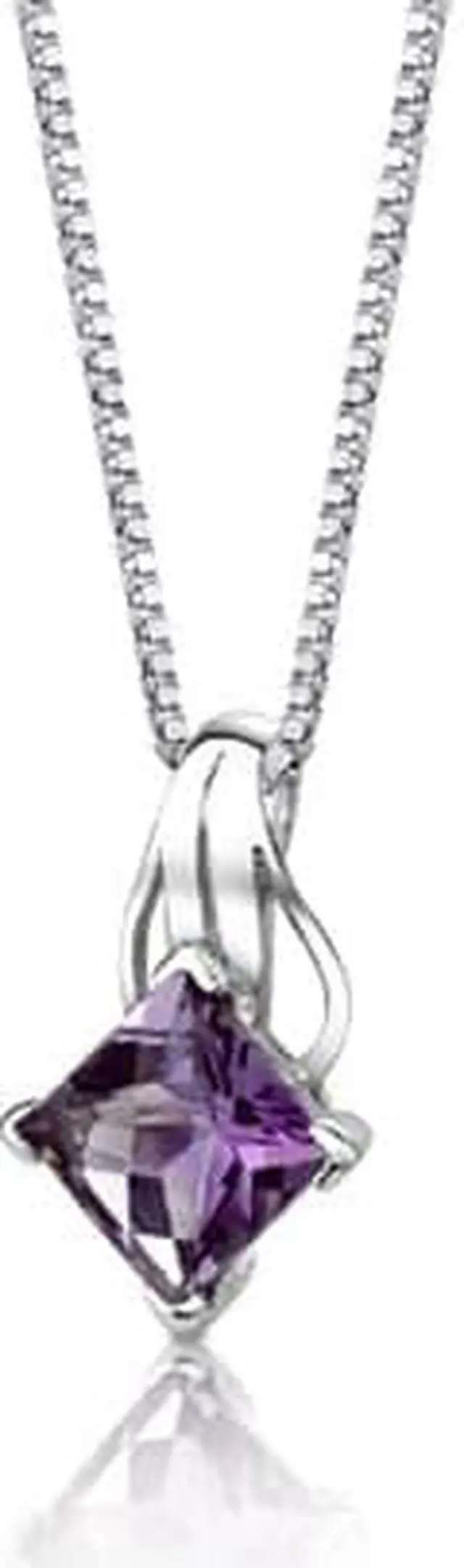 Gemstone: Genuine Amethyst, 1 piece, Princess Checkerboard Cut, 8.00mm. Gemstone has a vibrant rich color and eye clean clarity. Pendant is in Sterling Silver with .925 stamp and measures 3/4 x 3/8 inches and weighs 1.90 grams. Pendant features top quality workmanship and a beautiful finish. Includes Free 18 inch Sterling Silver Box Style Chain, Free Ribbon Gift Box.