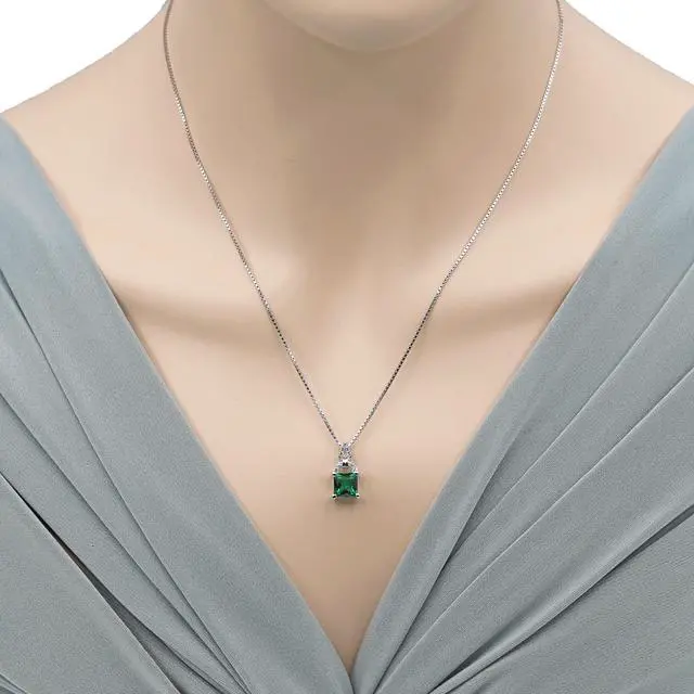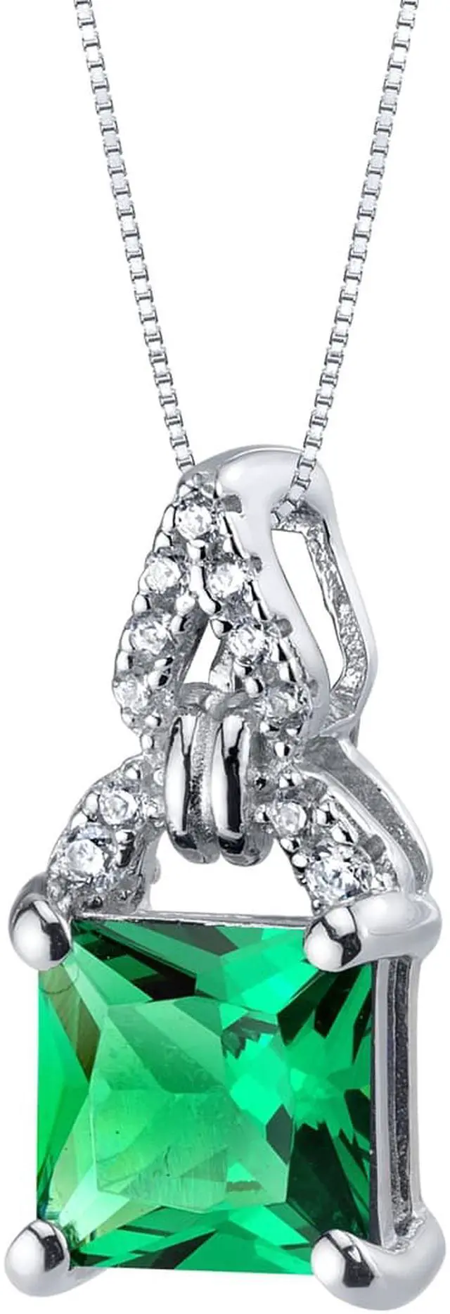This pendant necklace adds elegance to any ensemble with a splash of intense green. At the center is a wonderful simulated Emerald with a rich textural finish of hand cut facets and secured in a four-prong setting. An intriguing raindrop-inspired bail is adorned in lustrous Cubic Zirconia accents, all showcased from a box-link chain. Attractively boxed for easy gift giving.