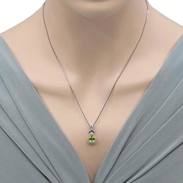 Designed for perfect symmetry, this pendant necklace radiates incredible beauty. Its pear-shaped genuine Peridot gemstone stands out, thanks to a halo of Cubic Zirconia against Sterling Silver. More glistening accents cover the elongated bail. Conflict-free, ethically sourced genuine gemstones only. Attractively boxed for easy gift giving.