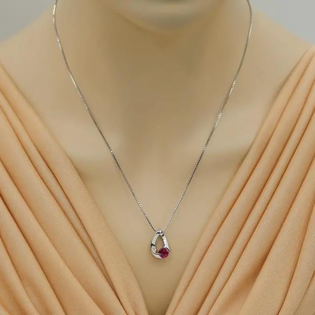 Expect out-of-this-world class with an orbital pendant necklace that showcases a deep red, created Ruby. It sits within an oval frame of twisted Sterling Silver and glistens from an abundance of handcut facets, creating plenty of interesting color, texture and character. Includes a box for easy gift giving.