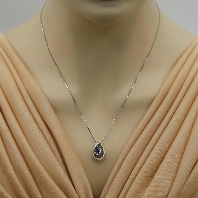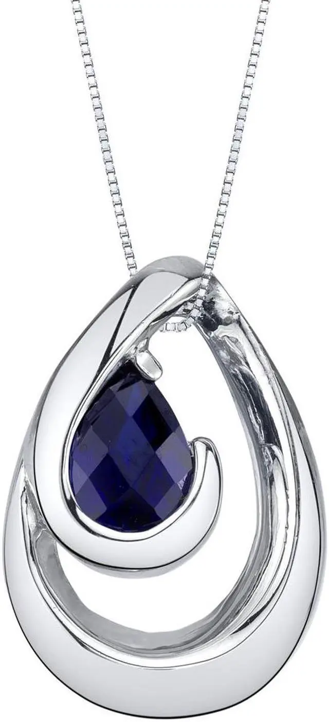 A continuous swirl of shiny Sterling Silver envelops a pear-shaped created Sapphire, making this pendant necklace a knock out! Quickly drawing the eye to the lively blue center are impeccably cut-by-hand polished facets for a rich textural finish. Includes a box for easy gift giving.