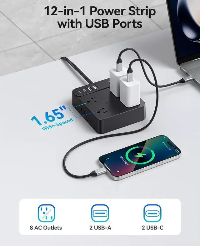 ·12-in-1 Power Strip OIRCO power strip with USB ports has 8 AC power outlets, 2 USB-A ports, and 2 USB-C port.