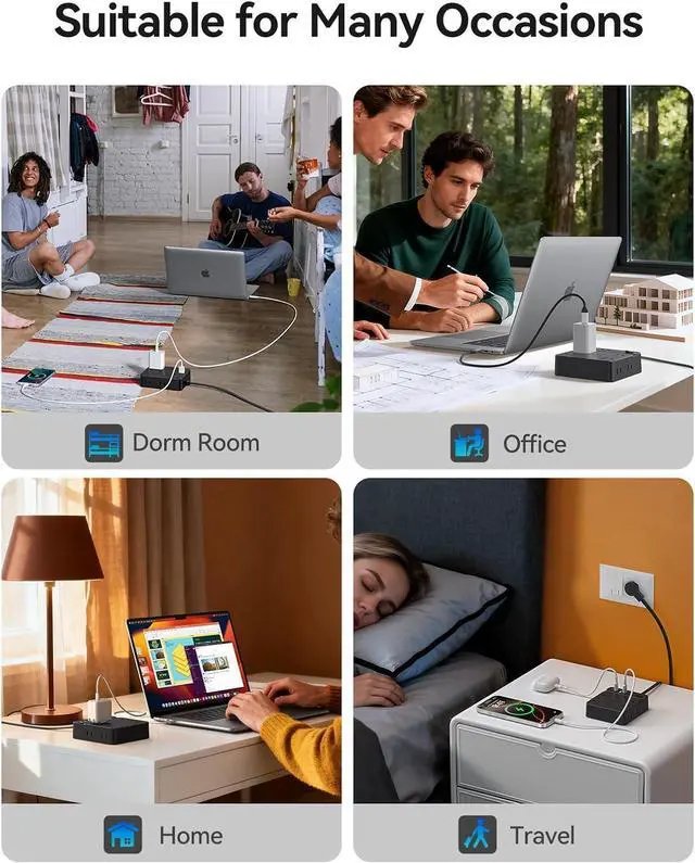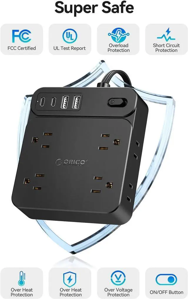 Suitable for Any OccasionsORICO power strip is compact size (4.8"*4.25"*1.26") suitable for indoor (office, bedroom, living room, and college dorm room.) and outdoor (travel, hotle) , 4 rubber feet at the bottom efficiently keeps it from slipping and sliding
