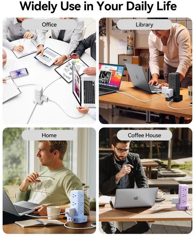 Space-Saving Vertical Tower Design: 4-side compact design tower power strip (3.39*3.39*6.46 Inch) takes up less space than traditional power strips while charging multiple devices, organizes messy cables, and keeps your desk tidy.