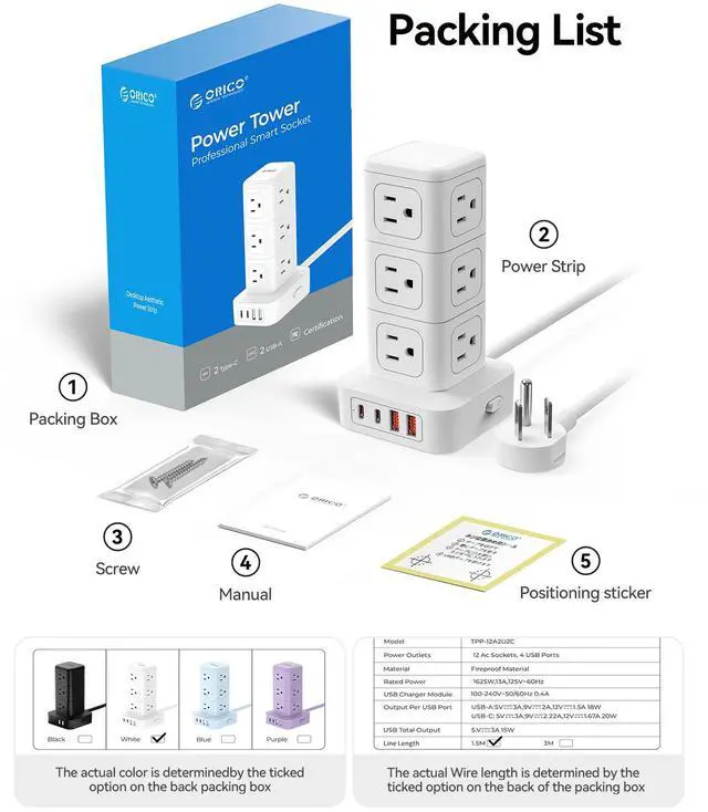 16 in 1 USB Power Strip Tower: Expands one outlet into multiple 12 AC outlets and 4 smart USB ports (2 USB-A and 2 USB-C).