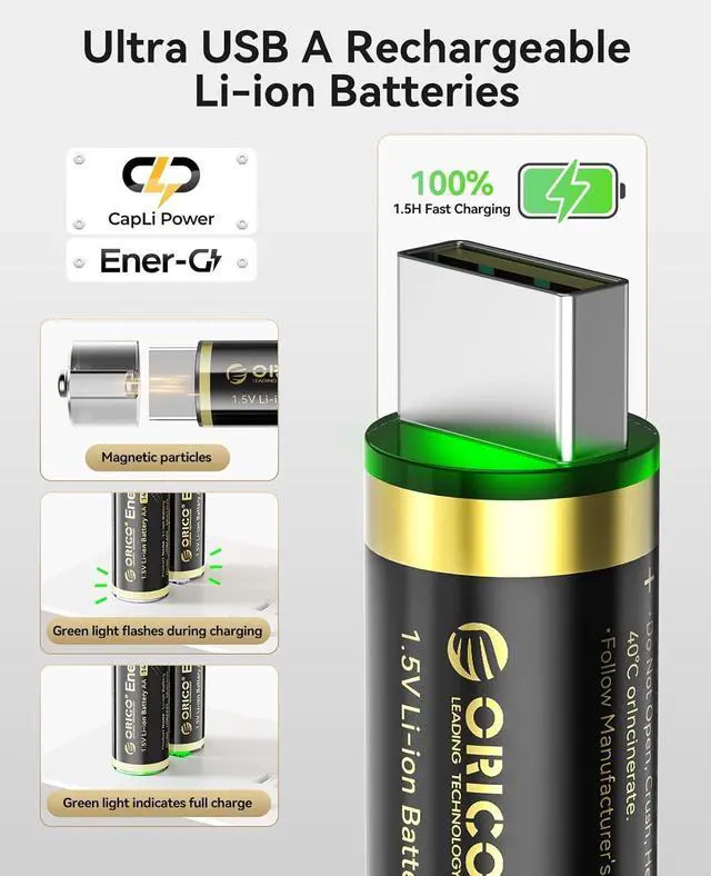 ORICO Ener-G Lithium ion Battery Rechargeable AA Batteries 1400mWh USB-A Direct Charging 1.5H Fast Full-Charged 1500 Cycles for Mouse Keyboards RC Remotes Flashlights 4 Pack