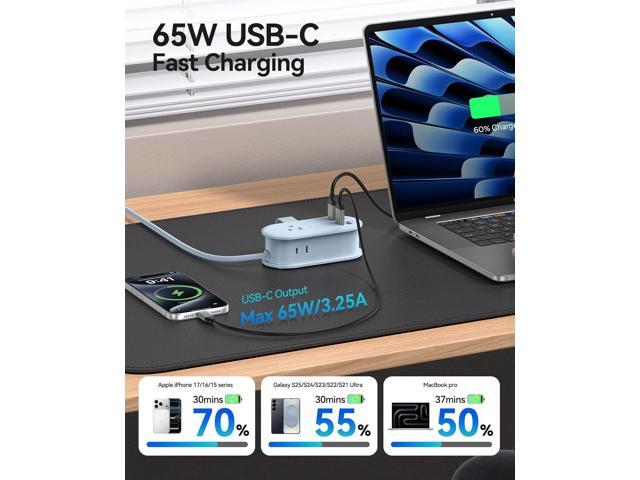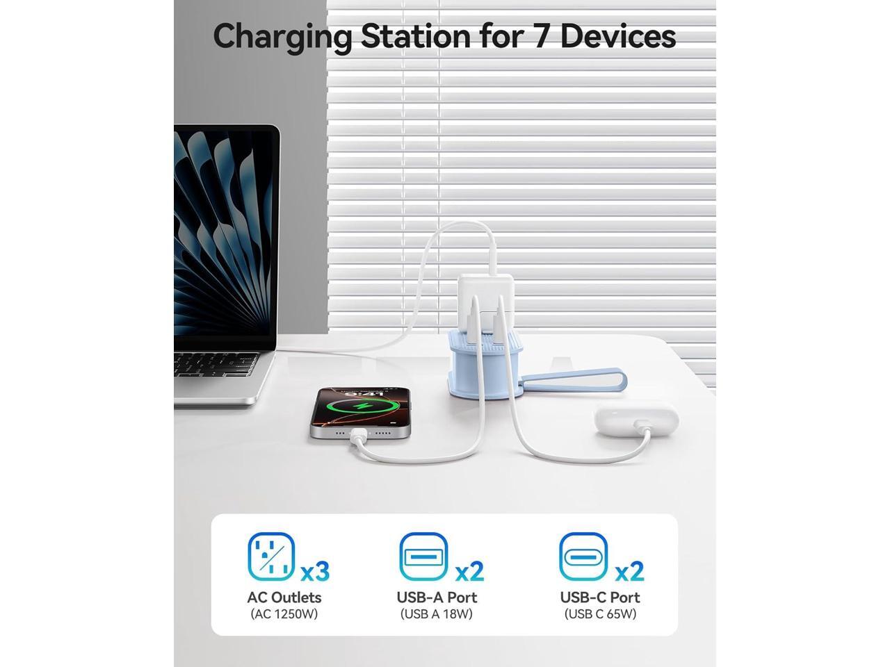 - ·7-in-1 Charging Station: Charging station simultaneously supports 7 devices, including 3 AC outlets, 2 USB-A(18W), and 2 USB-C(65W), USB total output(45W+12W).