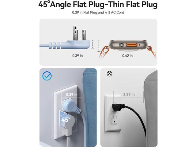 - ·45° Angle Thin Flat Plug:This plug features a 45 ° angled design and a compact appearance (0.39 inches thick), 4.43ft undetachable extension cord.
