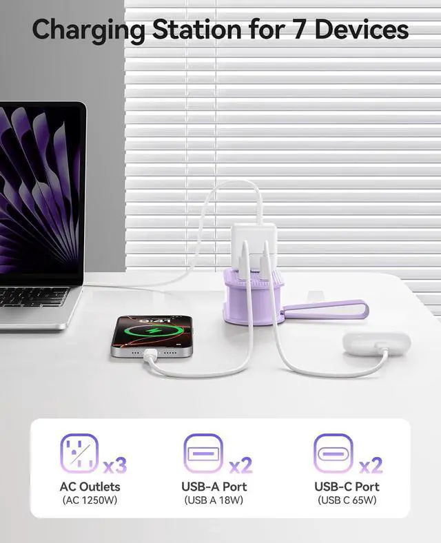 ·7-in-1 Charging Station: Charging station simultaneously supports 7 devices, including 3 AC outlets, 2 USB-A(18W), and 2 USB-C(65W), USB total output(45W+12W).