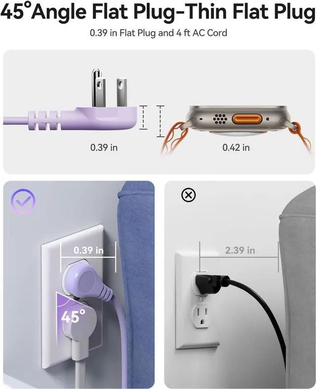 45° Angle Thin Flat Plug:This plug features a 45 ° angled design and a compact appearance (0.39 inches thick), 4.43ft undetachable extension cord, making it easy to plug and unplug in narrow spaces and effectively avoiding blocking adjacent sockets.