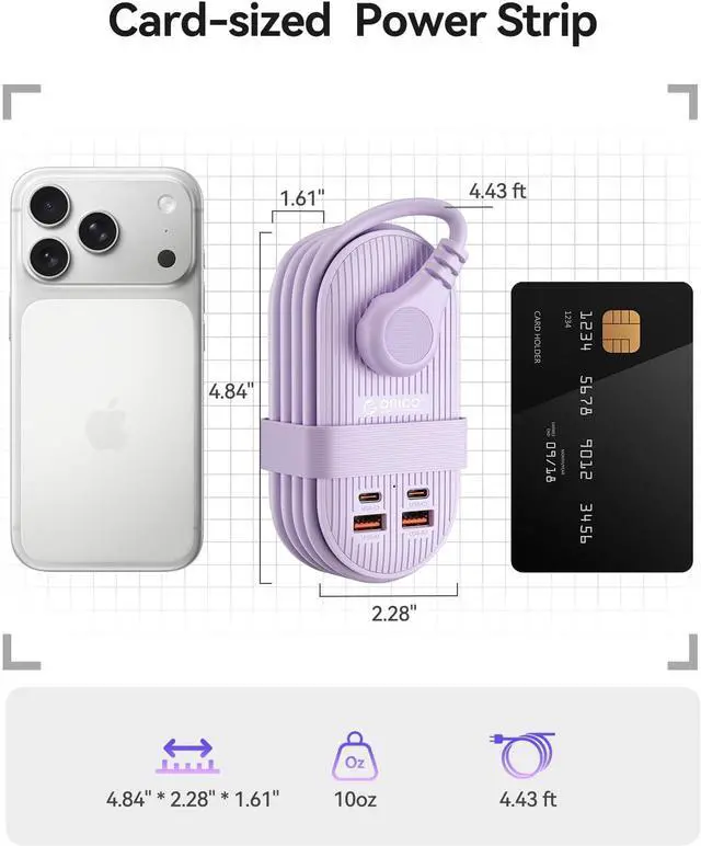 Winding and Tying Design: The design cleverly secures the extension cord to the product and comes with a dedicated strap, eliminating the problem of tangled wires. The overall appearance is simple and neat. Its size is only 4.84x 2.28 x 1.61inch, occupying no space whether it is placed in a suitcase or a backpack.