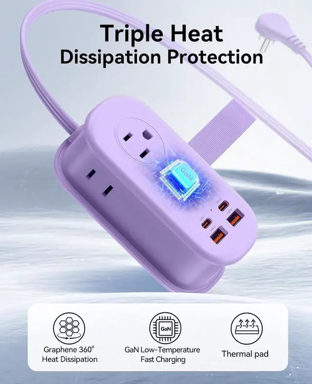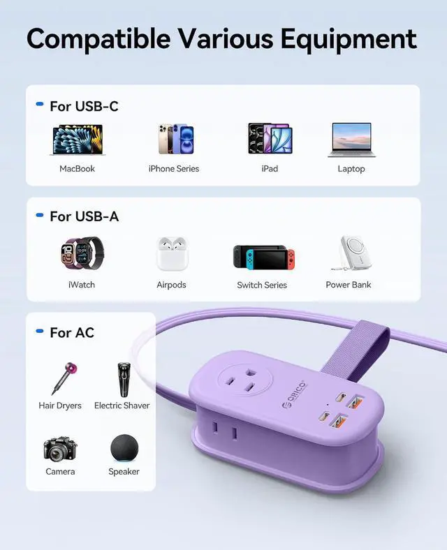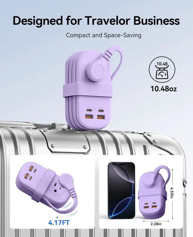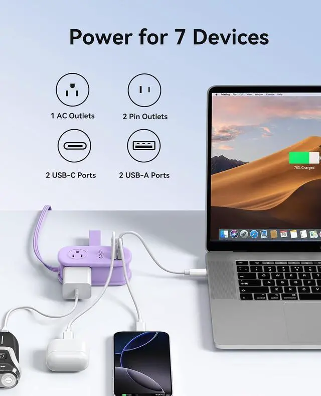 Compact design with 3 AC outlets, 2 USB-A ports, and 2 USB-C portsideal for charging multiple devices at once. Retractable cord makes it easy to carry and store.