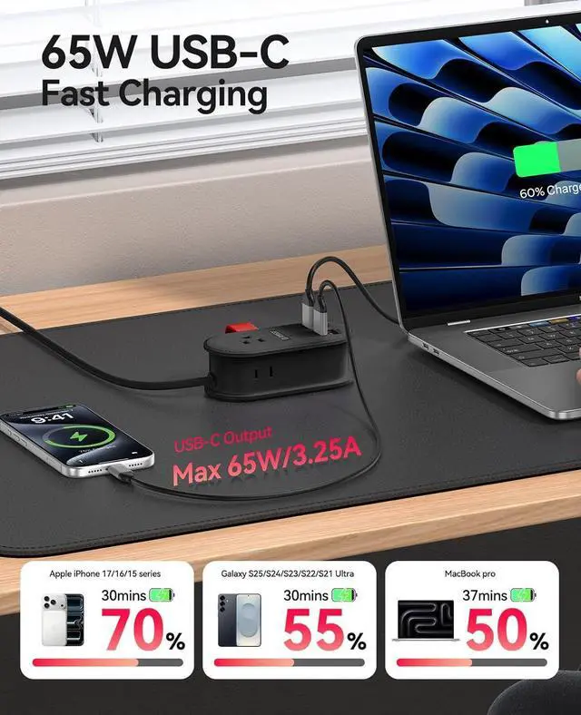 GAN 65W PD Fast Charger: GaN technology to significantly reduce energy loss and heat generation. The USB-C port provides a maximum output of 65W. It can charge your smartphones, tablets, and laptops all at once,which can charge an iPhone17 to 70%(30 minutes), a Galaxy S25 to 55% (30 minutes), and a MacBook Pro to 50% (37 minutes).