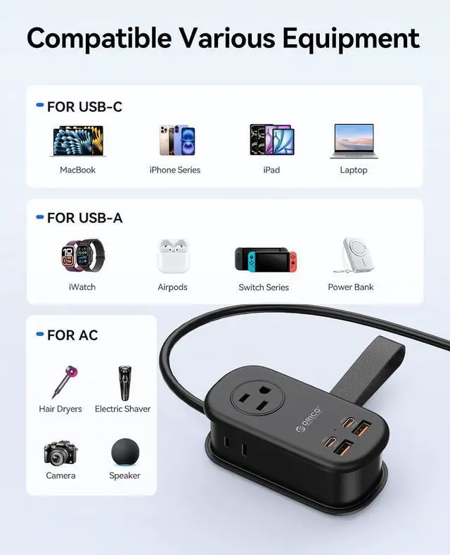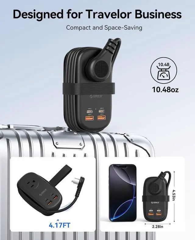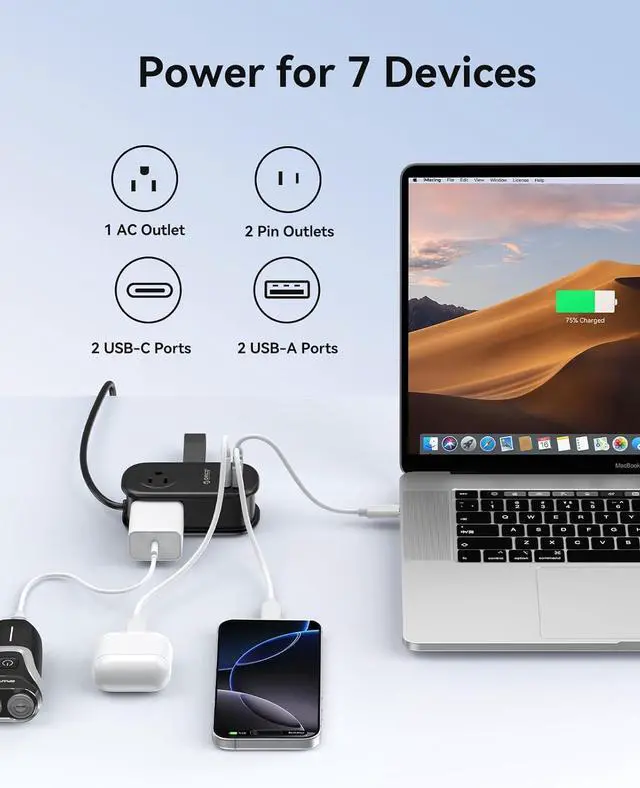 Compact design with 3 AC outlets, 2 USB-A ports, and 2 USB-C portsideal for charging multiple devices at once. Retractable cord makes it easy to carry and store.