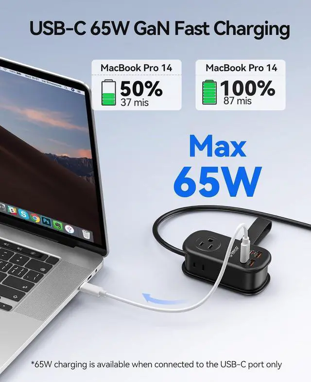Powered by GaN technology, it charges a MacBook Pro to 50% in just 37 minutes and fully in 87 minutes. Also supports fast charging for smartphones, tablets, and laptops.