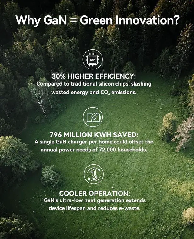GaN is 30% more efficient than traditional chargers, cutting energy waste and CO emissions. One GaN charger can save up to 796 million kWh annuallygood for your devices and the planet.