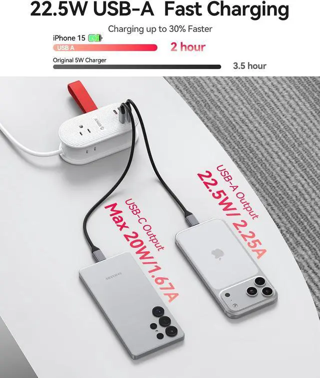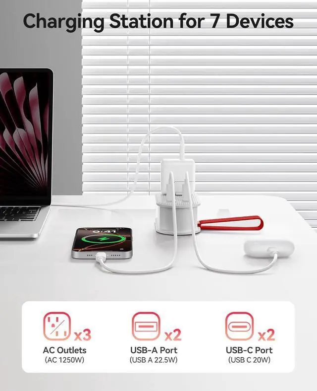 7-in-1 Charging Station: Charging station simultaneously supports 7 devices, including 3 AC outlets, 2 USB-A(22.5W), and 2 USB-C(20W), USB total output(15W).