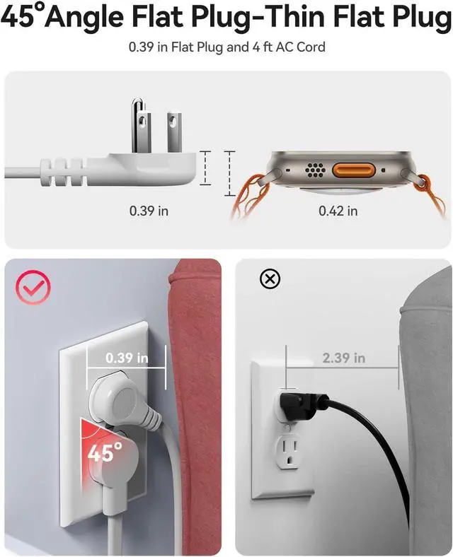 45° Angle Thin Flat Plug:This plug features a 45 ° angled design and a compact appearance (0.39 inches thick), 4.43ft undetachable extension cord, making it easy to plug and unplug in narrow spaces and effectively avoiding blocking adjacent sockets.
