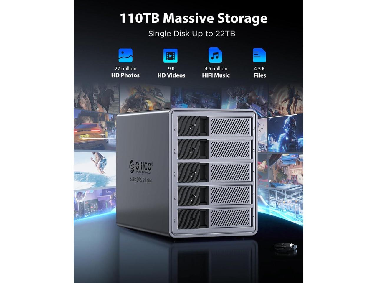 - [Supports 22TB Single Disk]: The 5-bay HDD enclosure accommodates 3.5-inch SATA disks, and the maximum storage capacity amounts to 110TB.