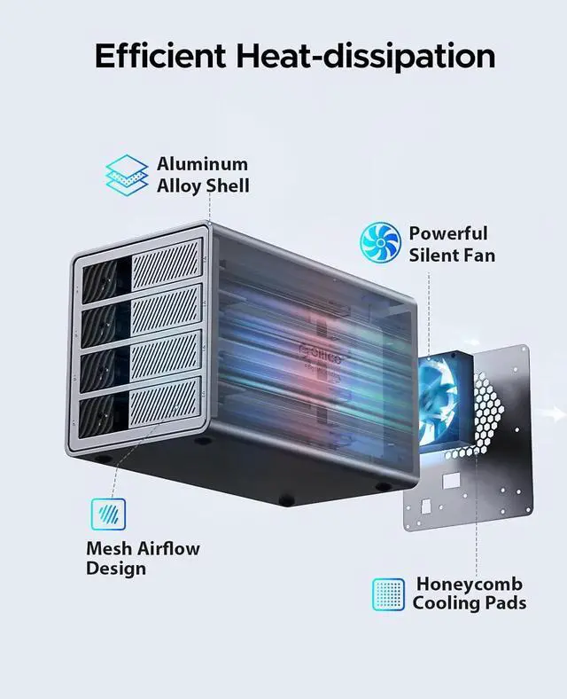 Excellent Heat Dissipation Performance:Product design front and rear vents, built-in 80mm cooling silent fan to improve the internal air flow of the hard disk cabinet, aluminum alloy body effectively accelerate the heat export.