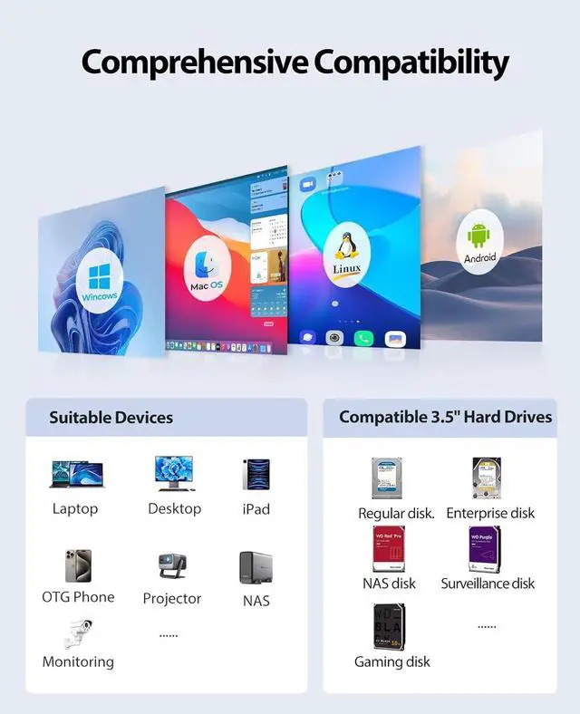 Safety Protection:The stent-free design can be quickly disassembled and assembled, and is equipped with an independent safety lock mechanism to effectively prevent the unexpected ejection or loss of the hard disk.