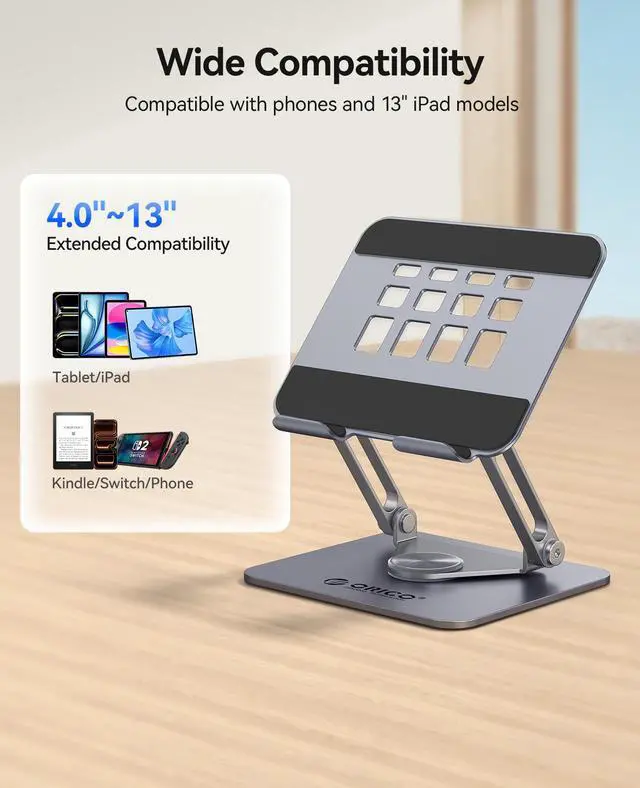 Compatibility with iPadDesigned as a reliable tablet holder for desk, this stand supports iPad models up to 12.9 inches and Kindle e-readers.