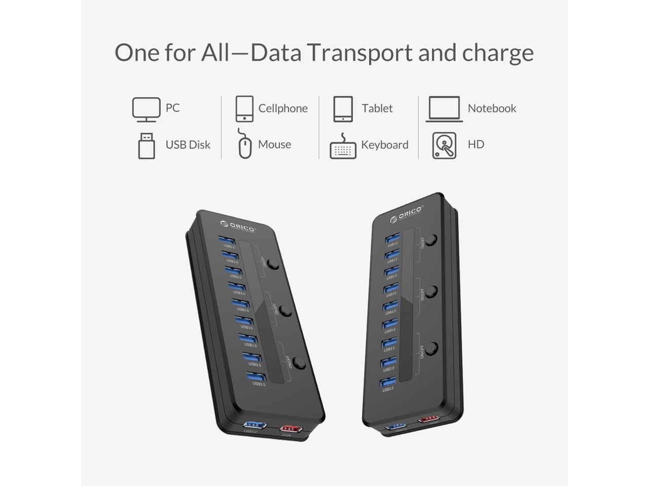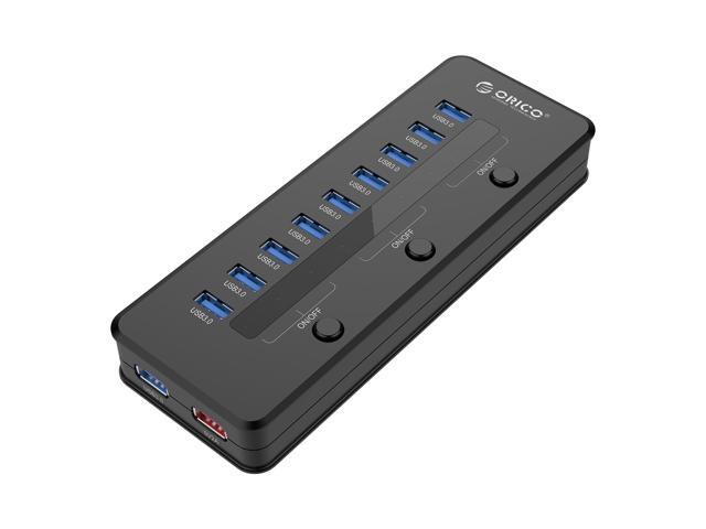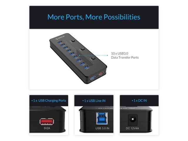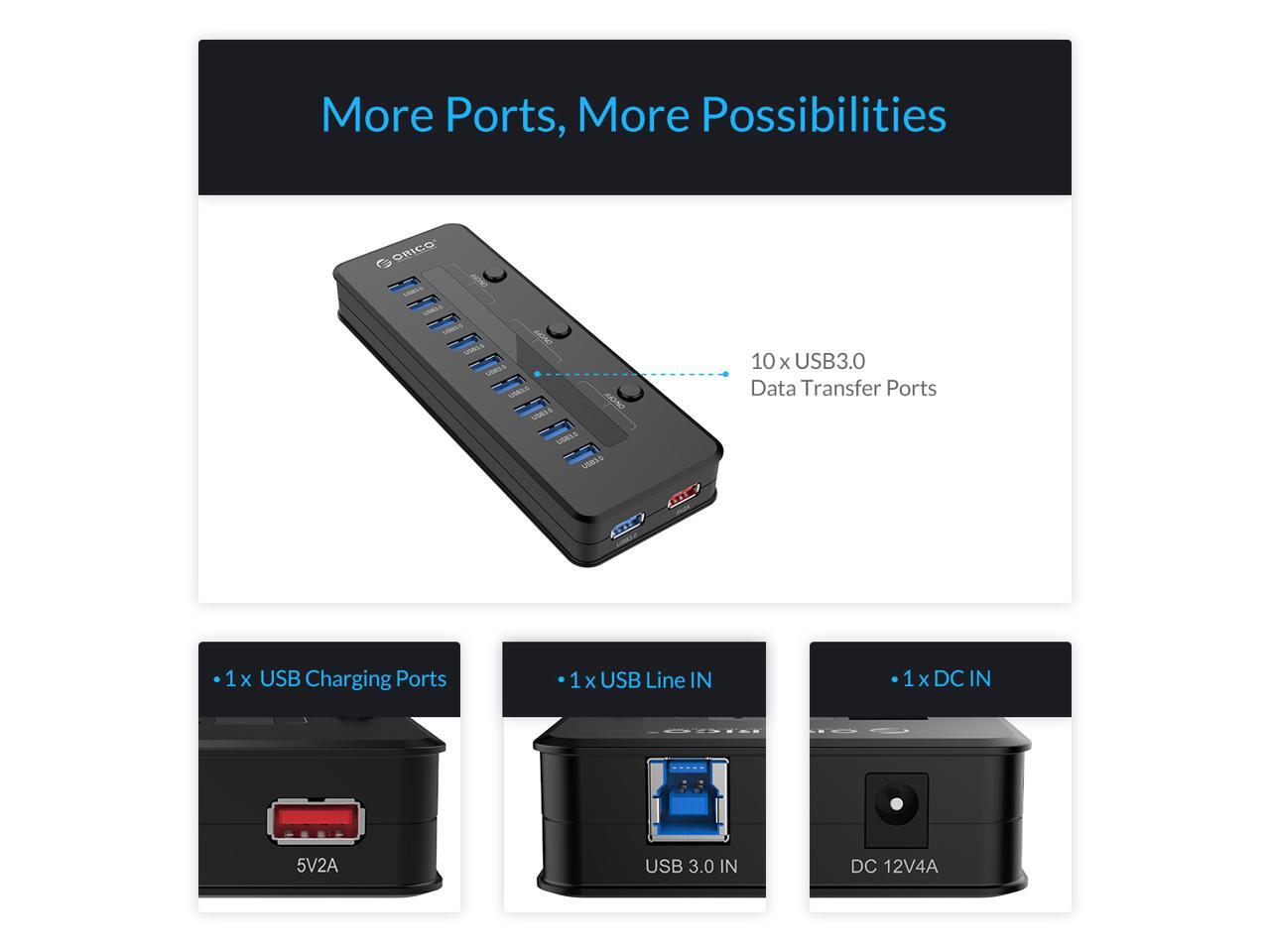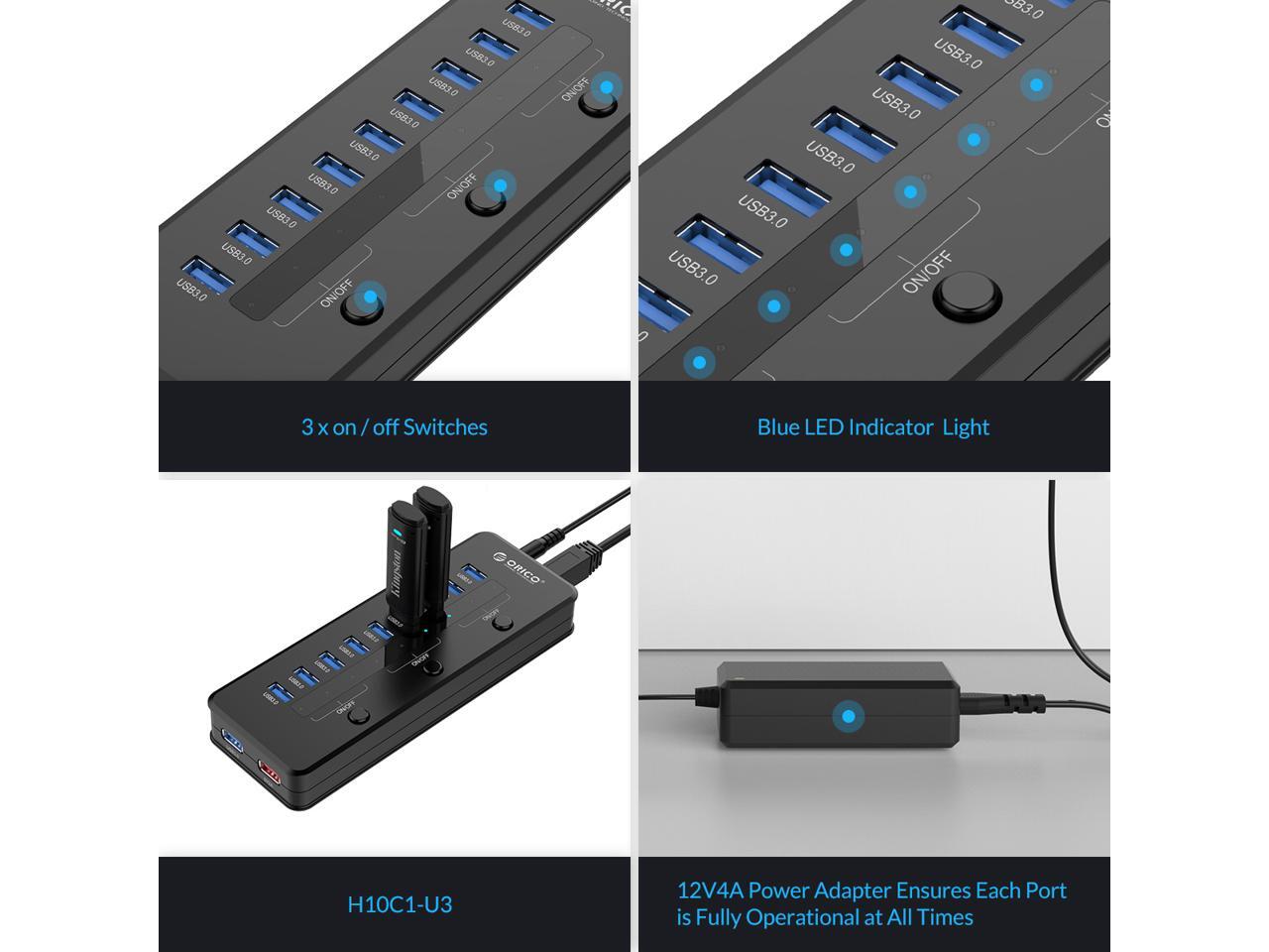 ORICO 10 Port Super Speed USB3.0 Hub with Smart 5V 2.1A Charging Port Come with 12V 4A Power Adapter and 3 Sets ON/OFF Power Switches for Windows / Linux / Mac OS -Black (H10C1-U3-US)