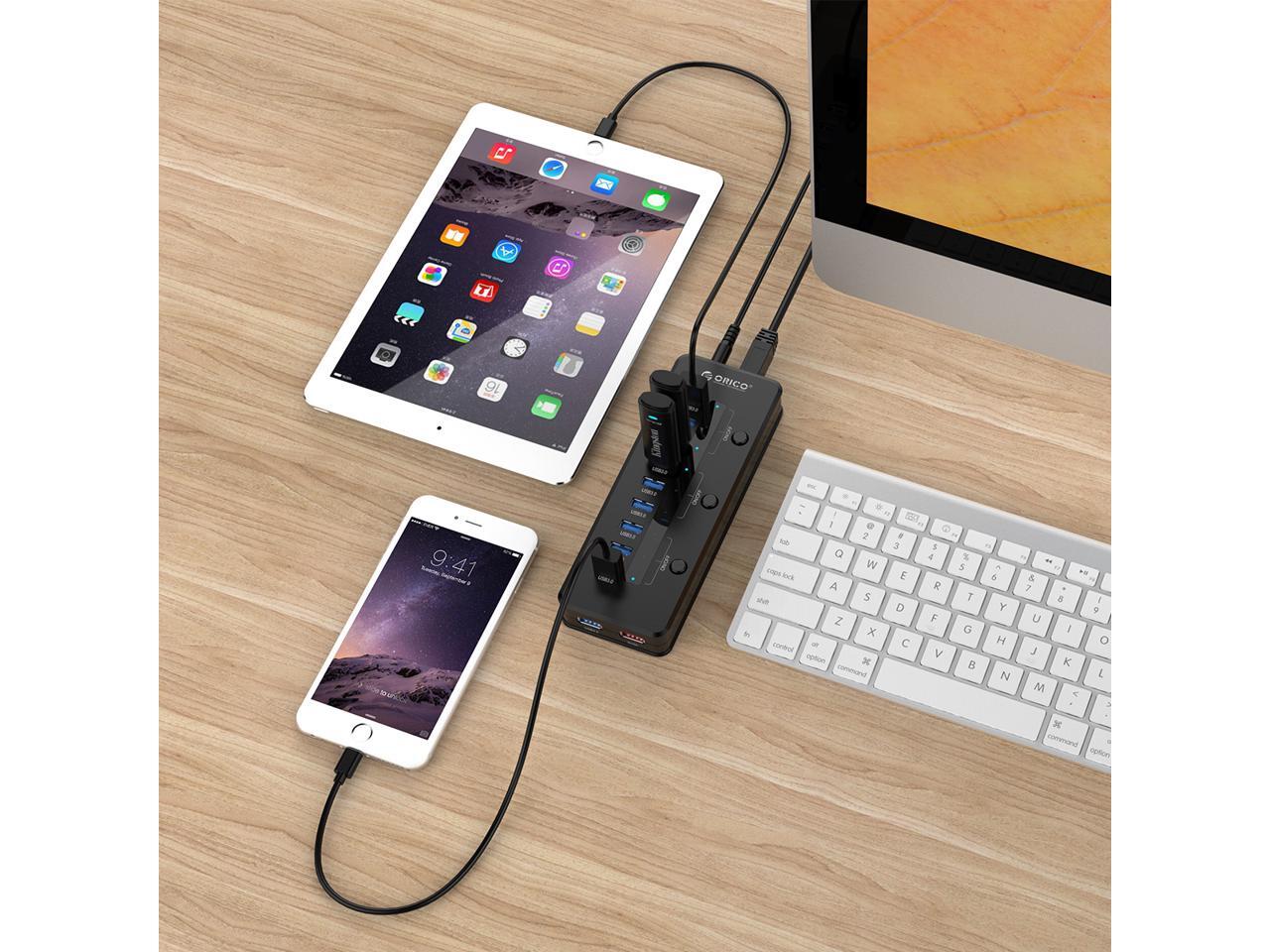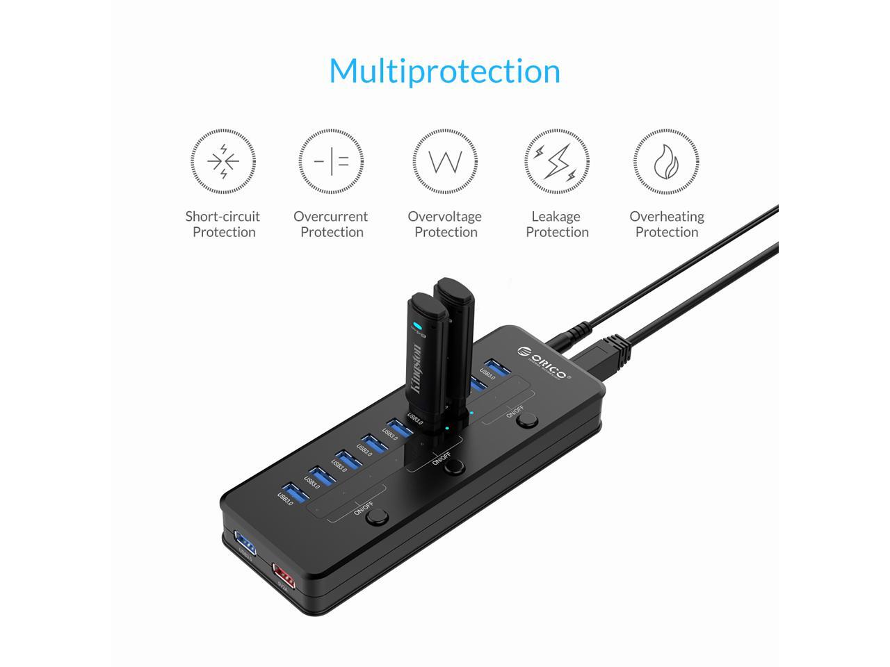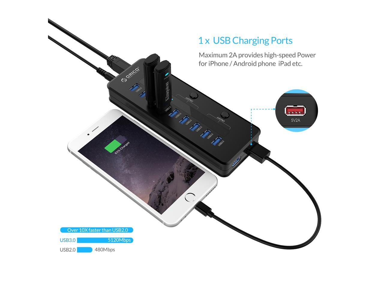 ORICO 10 Port Super Speed USB3.0 Hub with Smart 5V 2.1A Charging Port Come with 12V 4A Power Adapter and 3 Sets ON/OFF Power Switches for Windows / Linux / Mac OS -Black (H10C1-U3-US)