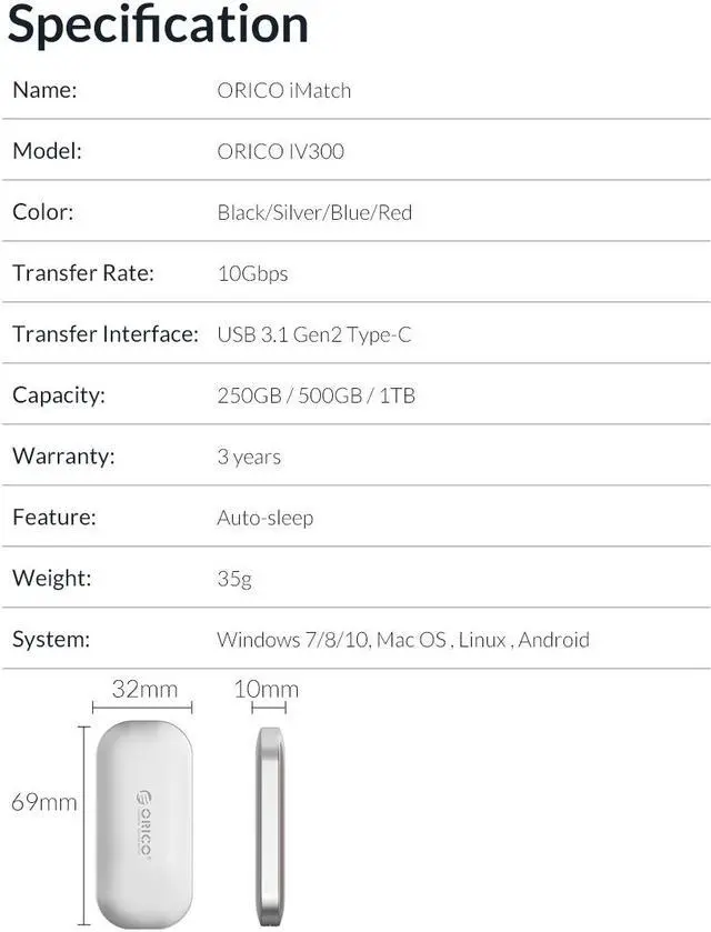 Product size: 68.8 (length) mm * 32 (width) mm * 10.4 (height) mm