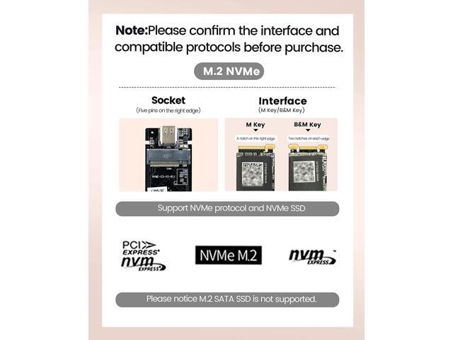 - Wide Compatibility--ORICO M208 M.2 enclosure compatible with both M.2 PCIe NVMe M Key,NVMe B+M Key in sizes 2280. NOT Compatible with M.2 SATA SSDs, M.2 PCIe AHCI SSDs, M.2 PCIe devices.